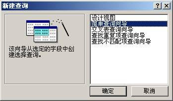 在Access中打开“客户关系数据库”窗口,单击“查询”按钮,然后在打开的窗口中,单击“新建”按钮,弹出“新建查询”对话框(图1)。单击选中“简单查询向导”项,并单击“确定”按钮。