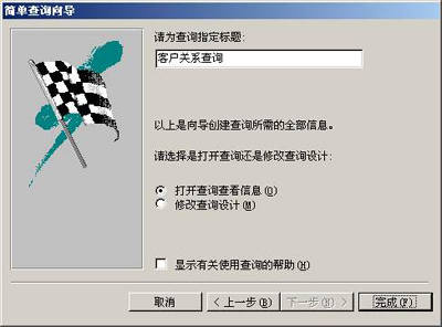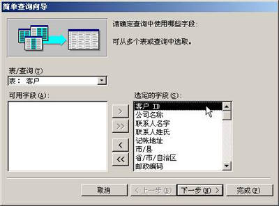 在打开的“简单查询向导”窗体中,单击“表/查询”栏,在下拉列表中选择“客户”数据表,然后单击“》”按钮,将客户数据表中的所有数据添加到右侧的“选定的字段”列表中,并单击“下一步”按钮(图2)。接着在“简单查询向导”窗体里的“请为查询指定标题”文本框中输入要查询的名称“客户关系查询”,最后单击“完成”按钮(图3)。
