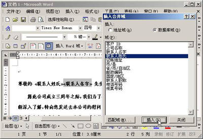 下面就可以向主文档中插入相关信息字段。首先将光标定位在收件人姓名位置,然后单击工具栏“插入域”工具按钮,弹出“插入合并域”对话框,然后从列表中选择需要插入的字段,比如“联系人名称”,然后单击“插入”按钮,完成后单击“关闭”按钮(图5)。