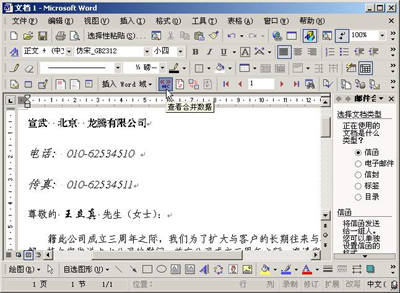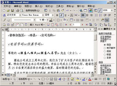 单击“邮件合并”工具栏中的“查看合并数据”按钮,预览并合并文档,此时“Word邮件合并向导”将自动定位“客户关系数据库”中的相关字段信息,并添加合并到指定的Word文档位置,同时显示在Word版面中(图7)。