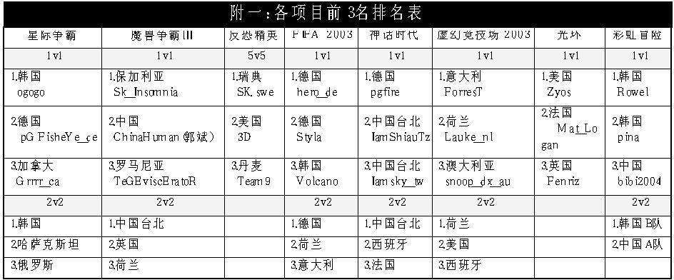 经过多年的发展,WCG的格局已经形成了一个三足鼎立的局面──以德国队为首的欧洲,以韩国队、中国队、中国台北队为代表的东亚和美国队。