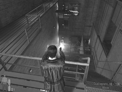 子弹时间的灵感来源于《黑客帝国》中尼奥不可思议的规避和动作技巧。二代中,当子弹时间模式开启,画面色调将由真实鲜明的色彩转换成为一种以灰白为基调的超现实主义风格,所有的物体运动在玩家眼中都如同慢镜头。你可以清楚地辨析出所有枪械的射击弹道、子弹飞行方向甚至弹药类型。沙漠之鹰沉重的击发声响、英格拉姆密集的子弹雨帘、霰弹枪爆裂迸出的细小颗粒、卡拉什尼科夫暴风般凶猛的火舌和狙击步枪华丽无比的子弹跟随视角……足以使游戏中的枪战场面成为一席视觉盛宴。