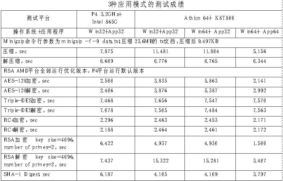 当然,上面只是理论上的分析,我们有办法证实吗?幸运的是AMD公司为我们提供了一套专门的测试程序,这些程序分别有32位和64位版本。Minigzip是一个命令行的压缩程序,而RSA则是一个加密和解密程序,还带有为AMD优化和未优化两种版本。因为P4运行为AMD优化版本效果很不好,所以P4平台运行的是未优化版本。测试结果见表格。