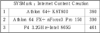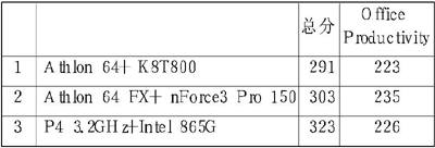 从总分来看,AMD64位平台不及P4平台,这有Internet Content Creation得分拖了后腿的原因。而在办公应用中,Athlon 64得分只比P4稍差,Athlon 64 FX的得分则大幅超过P4。要知道P4平台使用的是双通道的内存,Athlon 64这样的成绩很不错了。Athlon 64 FX平台多了512MB内存,成绩只能供参考。