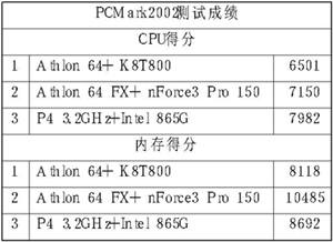 PcMark2002测试结果趋向与SiSoft Sandra一致,AMD 64位处理器的CPU得分比P4低,但内存性能接近或者超过P4平台。