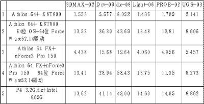 小结:这3个测试都使用OpenGL API,这也是专业图形软件常用的API。Athlon 64 FX的表现比P4略好,而Athlon64在新的显示驱动下只比P4稍逊风骚。