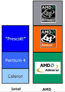 AMD推出的Athlon 64 3200+和Athlon 64 FX-51处理器,两者的实际频率都是2.2GHz,分别定位于不同的市场。Athlon 64 3200+定位于大众市场,而Athlon 64 FX-51定位于发烧友和游戏玩家,提供更强劲的性能。技术指标上的差别主要是Athlon 64集成的是单通道内存控制器,而Athlon 64 FX拥有与AMD Opteron完全一样的双通道内存控制器(注:Opteron是面向服务器市场的64位处理器)。Athlon 64 FX甚至采用了与Opteron处理器一样的Socket940封装,而Athlon 64采用的是Socket754封装。特别值得一提的是,Athlon 64 FX要求搭配通过注册登记(指通过AMD认证)的内存。