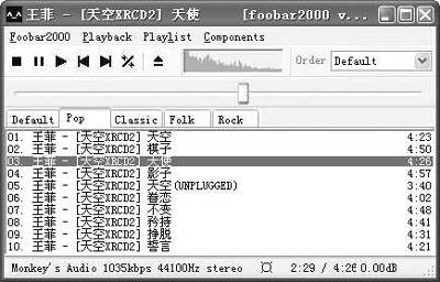 Foobar默认只有一个Default播放列表,这显然不够用。我们可以右键单击Default弹出菜单,选择“Create new playlist”(创建新的播放列表)。这时我们就有了一个新的名为“New playlist”的播放列表,右键单击它,选择“Rename this playlist”修改播放列表名称,比如修改成“Pop”(流行),以便用这个列表专门播放流行音乐。依此方法我们继续新建播放列表诸如“Classic”(古典),“Folk”(民歌),“Blue”(蓝调)……这样将喜爱的歌曲分门别类地加入,以后就不用满硬盘找歌听了。而且,这些列表还可以保存下来供其他播放器使用(图2)。