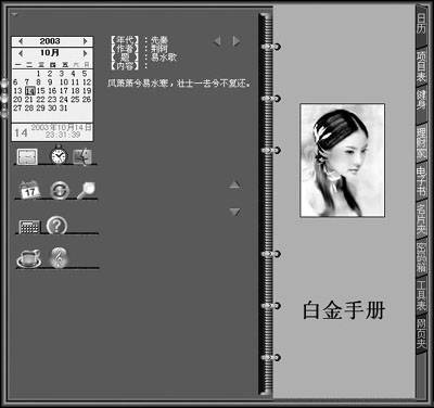 强身健体已经成为当代人的一种时尚,白金手册也为Office一族提供了强身健体的天地,“翻开”手册的“健身”页,就可以在该页中详细为自己的“健身事业”制定一套周密的计划。各餐饮食计划、各种食物的等值热量速查表为你的科学饮食结构指明了方向。