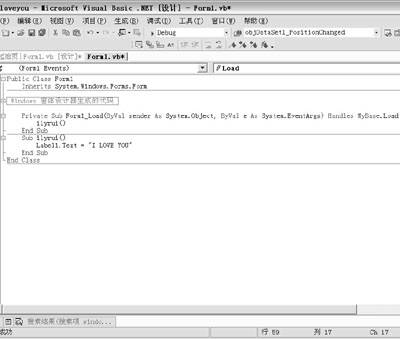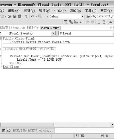 程序说明:在这个程序中我们通过对标签控件的属性修改使它显示“I LOVE YOU”文字。