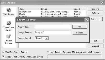在“Set Proxy”对话框中我们还可以看到,GB还有“Web Proxy”、“Translate Proxy”两个选项。“Web Proxy”用于支持浏览某些网站所提供的特殊网页,而“Translate Proxy”则用于将一些网页翻译成更便于浏览的语言,方便我们浏览。因此,最好将“Enable Web Proxy/Translate Proxy”这个复选框也选上。