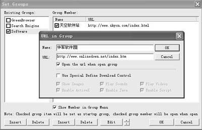 “群组”(Groups)功能大家都比较熟悉,它可以将若干个URL地址保存为一个组,并通过一次点击就可全部打开这些网页。如果要将当前网页加入到已有的群组(如Software组)中,那么只要依次点击“Groups→Software→Add URL to this Group”即可。而如果要创建新的群组,那么只要点击“Groups→Set Groups”命令,然后点击“Set Groups”对话框(图3)下端左边第一个“Insert”按钮,并输入新群组的名称,再点击另一个“Insert”按钮,然后输入记录的名称、URL地址等信息,并且要勾选“Group Member”列表中的所有记录,这样,我们就可在“Groups”菜单中执行“Open All Checked Group Member”命令打开该组中所包含的全部网页。