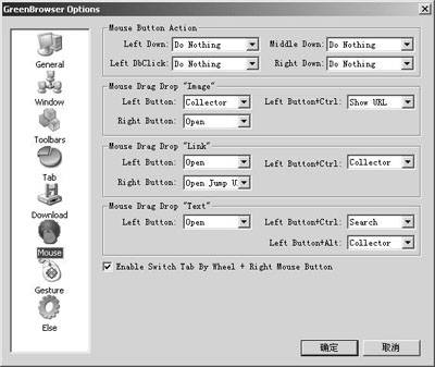 “鼠标手势”可方便我们更快捷地执行某些指令。如在页面空白处按下鼠标右键,并向右方移动,即可切换到下一窗口中,而且各种不同的移动组合的相应指令可以在“Options→GreenBrowser Options”对话框中进行设置(图4)。“鼠标拖曳”则可以帮助我们方便地查看大幅的页面或图片。我们只要按住鼠标右键并移动,就可以滚动页面,注意不要在链接上进行点击和拖曳,而且不能在软件中同时启用“鼠标手势”和“鼠标拖曳”两个功能。