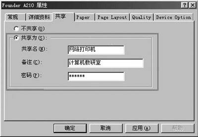 在主机上安装打印机(笔者使用的是Founder A210激光打印机)。打开“我的电脑”下的“打印机”或点击“开始→设置→打印机”,鼠标右键单击已安装好的“Founder A210”,在弹出的菜单中选择“共享”,进入“Founder A210”属性对话框中的“共享”选项卡,设置如图1所示。其中密码项是为了保证不让非法用户使用此打印机而设置的,先点击“应用”,再点击“确定”按钮。