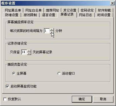 ③“屏幕记录”用来设置捕捉学生机屏幕的选项,在此项设置中,可以设置自动记录每一台工作站的屏幕等相关参数,具体设置内容如图1所示。