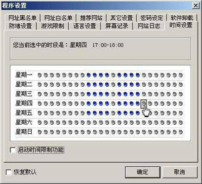 ⑤“时间设置”用来设定学生机的上网时间(图2)。在此项设置中,可以按照1小时的间隔来设定学生机的上网时间。启用这项功能(勾选“启动时间限制功能”)后,学生只能在指定的时间上网,但并不影响学生使用计算机的其他功能。这项功能对于中、小学校园网来说比较有意义,因为有的学校并不允许上机的时候都安排上网(主要是费用的问题)。通常情况下,可根据每个学期的上机课程表进行设置。