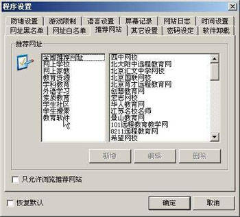 ⑦在“推荐网站”中,有网络园丁推荐的一些对学生有益的优秀网站,用户可以分门别类地添加、编辑、删除推荐给学生访问的优秀网站(图3)。在这个选项卡中,如果选中“只允许浏览推荐网站”,学生机就只能访问在“推荐网站”列表中列出的网站。
