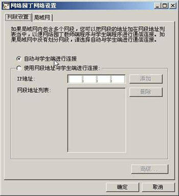 在主程序界面中点击“选项→网络设置”,进入“网络设置”界面(图4)。如果网络园丁的学生机与控制端不在同一网段上,请选择“使用网络地址与学生端进行连接”,并在“IP地址”栏里添加所有学生机使用的网段;如果网络中只有一个网段,选择“自动与学生端进行连接”即可。在“局域网”设置中,可设置教师端扫描局域网内所有计算机的时间间隔,以及开机启动时自动扫描网络。