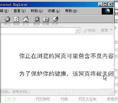 学生机在安装好网络园丁的学生端软件之后就可以使用了。当学生试图访问不良网站时,网络园丁会在不良内容出现之前自动发出提示并关闭当前的浏览页(图5),同时向教师控制机发出警告。如果学生没有在指定的时间上网,网络园丁会发出提示并关闭浏览器。