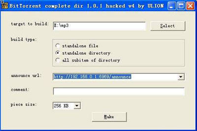 现在就可以用completedir制作“.torrent”文件,把要发布的文件统一放到“E:\mp3”目录下,再运行“btcompletedirgui.exe”程序。