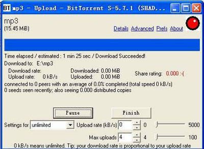 2.BT下载文件完成后,不要立即点击“Finish”按钮关闭窗口,这样你可以为别的局域网用户提供下载服务,这也是BT为什么下载的用户越多,下载速度越快的原因。