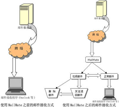 MailMate会运行于你的邮件服务器和电子邮件客户端软件(例如Outlook、Foxmail等)之间,MailMate的工作原理示意图如图1。每隔一段时间它都会自动检查并接收新邮件,并按照内置的过滤规则将垃圾邮件和正常邮件分别存放在不同的虚拟文件夹中,你的电子邮件客户端软件将不再从邮件服务器端接收邮件,而是直接从MailMate端收取过滤之后的正常邮件,这是它和其他垃圾过滤工具的一个明显区别。