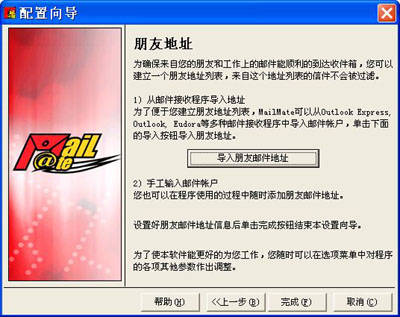 3.再单击“下一步”,会弹出如图3所示的对话框。为了防止误删正常邮件,你需要在这里建立一个朋友们的邮箱地址列表(相当于“白名单”),地址列表中的邮件地址在任何情况下都不会被过滤。大家只要单击“导入朋友邮件地址”按钮,即可自动导入Outlook、OE或Eudora的地址簿。而对于Foxmail,则需要先把地址簿导出为地址簿文件(.wab、.csv、.txt三种格式皆可),然后再导入MailMate。