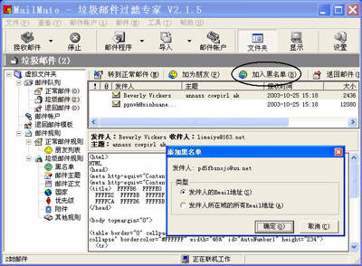 使用MailMate预置的垃圾邮件过滤规则可对付97%的垃圾邮件,但百密总有一疏,漏网之鱼当然也少不了,如果你发现了未被正确过滤的垃圾邮件,可在选中该邮件后,单击“加入黑名单”将该邮件地址列入“黑名单”(图4),以后MailMate会自动拒收来自该邮箱的任何邮件。