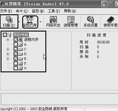 木马查杀功能是这款软件的最基本的功能,它可以对硬盘、内存等各种存储设备中的木马进行有效的查杀。该软件的查杀操作界面非常简洁(图1),只要勾选其中相应的查杀选项,如进程内存、硬盘盘符等,然后点击“扫描”按钮,就可以对内存和硬盘中的木马进行查杀。但大家一定要注意经常升级木马数据库,这样才能查杀最新的木马,Trojan Ender支持在线升级,点击“工具→在线升级”,就可以自动完成程序和木马数据库的更新。另外,查杀木马要以预防为主,Trojan Ender木马监控器一定要随时打开。