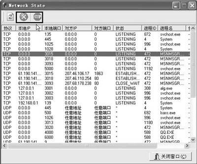 点击“工具→网络状态”,在弹出的“网络状态监视”窗口中(图2),会看到系统中所有进程的网络状态都在其中,而且它是在网络层对系统进程进行监控。监控信息非常详细,不管木马使用的是TCP协议还是UDP协议,木马端口号是某一固定端口号还是若干个可变的端口号,只要木马在系统中运行,Trojan Ender都可以进行监控,并能详细地列出协议类型、本地IP、本地端口、进程ID等信息。一旦发现列表中有木马存在,应该立刻选中该木马选项,然后点击“断开选中连接”按钮和“中止选中连接所对应的进程”按钮,最后再使用Trojan Ender对系统中的木马进行查杀。