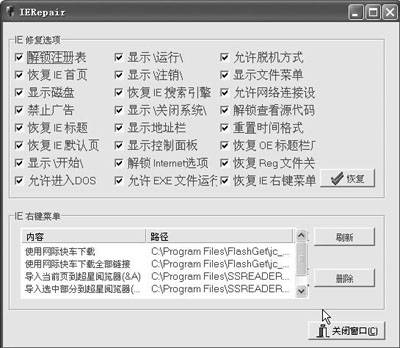 另外,“IERepair”还可以删除IE右键菜单项,在“IE右键菜单”列表框中选中想删除的右键选项,然后点击“删除”按钮即可。