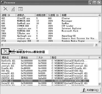 在主界面,点击“工具→进程管理”,在“进程管理器”窗口中的进程列表框中,选中调用DLL木马的进程,然后在下面的模块名列表框中,找到DLL木马模块,然后点击“卸载选中DLL模块”按钮(图4),这样就中止了DLL木马文件的调用,再使用木马查杀功能查杀DLL木马或手工删除这些DLL木马文件即可。
