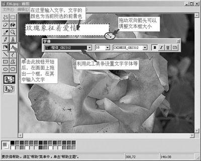 以添加文字为例,在画图中通过“文件”→“打开”将需要添加文字的图片读取进来,然后单击工具栏上的“A”(文字按钮),之后在图片上拖出一个虚线矩形区域(如果拖出的边框偏小,输入文字时会自动调整以适应文字),接着在其中输入文字,此时会自动出现“字体”工具条(如果没有出现,则点击“查看”→“文字工具栏”),使用该工具条可以设置字体、字号和让文字加粗、倾斜、加下划线等,也可以让文字变成竖排版式(图1)。