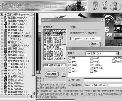 进入游戏大厅后,我们可以在左侧看到大量的游戏(图2),还能看到有好几千人在同时进行游戏。先不要急着玩,要先设置游戏路径。这里以CS1.5的设置为例(其他的游戏也都相同),单击右上角的“设置”按钮(图3),在弹出的窗口中点击“自动搜索”按钮会自动搜索游戏路径。也可以手动设置,按“浏览”按钮,然后找到你的CS1.5在硬盘的安装位置,找到CS1.5的主程序,可以看到列表中显示“CS1.5已设置”,这样游戏路径就设置完毕了。