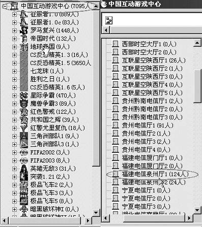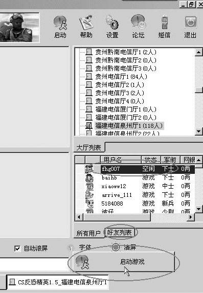 游戏路径设置好了就可以开始玩游戏了,先选择你要玩的游戏(如CS1.5),双击进入该游戏的大厅,然后再选择一个人多的游戏厅双击进入。在这个界面(图4)右侧的用户列表中,显示了当前全部用户和他们的状态:是在玩游戏或是在聊天。我们在进入游戏之前可以先找些志同道合的人聊聊天,交流一下游戏经验。如果聊得来还可以把他加为好友,以后在好友列表里就知道他在不在线了。你还可以看到每个人都有一个军衔,刚开始玩都是新兵,要升官就看你的水平了。笔者不才,只混到下士军衔。