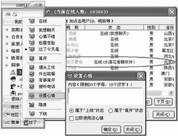 在UC上查找用户时会发现显示结果中有“状态”栏,其中绝大多数的用户状态是“在线”,其实大家可以随意填写有趣的在线心情内容,吸引更多的用户将你加为好友。