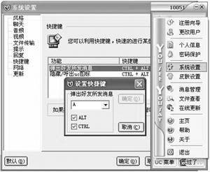 按下“Ctrl+Alt+S”组合键可以将UC程序从桌面上隐藏,包括右下角的UC图标。如果想重新显示主界面的话,再按一下这组合键就可以了。收到消息时按“Ctrl+Alt+Z”组合键可以直接弹出聊天信息对话框。