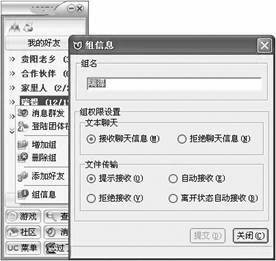 用鼠标右键点一下选定的用户组,会看到弹出的菜单中有“组信息”字样。在选择“组信息”弹出的窗口中可以对选定的组进行接收聊天信息和文件传输方面的设置(图3)。比如跟好友吵架了,不想接收她/他发来的消息,又觉得将她/他拖入黑名单可惜,可以新建一个“回收站”组,再把这个组设置成“拒绝聊天信息”,这样就不受她/他骚扰了。要是经常和好友用文件传输功能共享资料,则可以将对方所在的组文件传输属性设置成“自动接收”,这样相当于多了一个私人秘书为你服务。