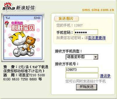 ①在新浪短信页面中选择“图片”链接,会进入到手机图片页面,在此选择手机类型。