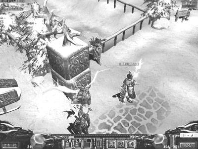 在失落之塔尚未开放之前,冰风谷(图3)和地下城是玩家冲100级的主要地点,其中尤以在冰风谷的战士游斗最突出。玩家等级达到15级之后可以进入这个场景,低级的玩家可以在右面的门口附近打雪虫升级,或者选择与高级的玩家一起组队打高级怪物分经验升级。《奇迹》的经验分配公式注定了高级玩家喜欢和低级玩家组队,因为这样他们可以获得更多的经验值,而低级玩家只需要跟在他们后面捡钱捡装备升级即可。冰风谷主要让玩家升级的怪物是雪人王,数量众多但是分散,这决定了打雪人王的主力是战士,而战士最喜欢组的则是骑着小马可以跑步的智弓,这样的组合在很长一段时间是冰风谷独特的风景线。战士使用旋风斩的太阳剑或者回旋斩的死神镰刀可以把雪人王从屏幕上打飞。这里不利于敏弓打怪,同时法师的攻击力也差战士太多,没有竞争力。以至于整个冰风谷的雪人王地段基本上被各种中级战士承包,也正是在这个时期,战士逐步发展成为《奇迹》人数最多的一个职业。