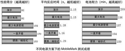 我们使用MobileMark测试了G-MAX在多种电源方案下的综合性能和电池使用时间,结果如下图所示。
