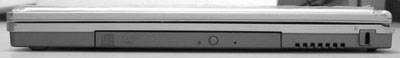 右侧可以看到光驱和防盗锁孔。G-MAX采用的是东芝R9012康宝光驱,厚度只有9.5mm,具有8×DVD-ROM、24×CD-ROM和16×写、10×覆写的能力。在右边的防盗锁孔可能一般很少注意到,在电脑城和展会上看到的笔记本电脑常常就是用防盗锁插在这里固定的。