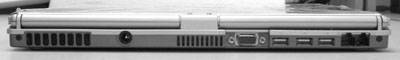 后面是接口集中的地方。最左边可以看到的铜质散热片的一排小孔是出风口,而冷风是从VGA接口旁边的进风口抽入,通过空气的流动把内部的热量带走。在出入风口之间是外接电源接口,VGA接口右边是3个USB2.0接口,然后是LAN网络和Modem接口。G-MAX未设计笔记本电脑常见的红外口和S输出端子,不过对用户的影响不会很大。
