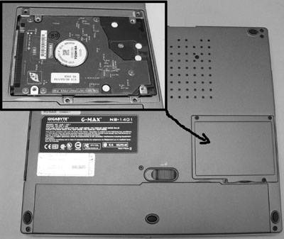 将G-MAX翻过来,可以看到产品铭牌,散热孔、一块盖板和锂电池。值得一提的是G-MAX底部外壳也采用了金属材质,这能够改善传热效果。揭开唯一的一块盖板,露出隐藏的东芝硬盘,容量为40GB。在硬盘上还贴有一层塑料保护膜。有心的读者可能会问了,要增加内存怎么办啊?这确实是一个问题,要升级G-MAX内存必须将笔记本电脑全拆下来才行,普通用户没有办法完成这样的操作。