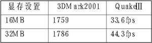 G-MAX显卡为主板集成Intel Extreme Graphics 2显卡,共享内存作为显存,容量可以在BIOS中设置为16MB和32MB。显卡3D性能测试成绩如下表,测试时使用的电源方案为“一直开着”,分辨率为1024×768×32bit。