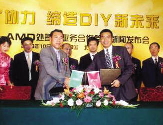 2003年10月31日,电脑用户熟悉的美国AMD公司与中国的神州数码公司在北京联合举办了规模盛大的新闻发布会,宣布签署分销合作协议。根据合作协议,神州数码将承担AMD盒装处理器产品在中国DIY市场的营销和推广工作,并提供配套的售后服务。合作计划还包括在全国建立500家神州数码-AMD处理器形象店,继续提升AMD和神州数码在DIY用户群中的知名度。这一举动将为国内DIY市场发展格局带来变化。