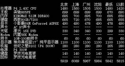 这样一来全国各地的价格就统计出来了,而令我吃惊的事情同时也发生了。从本人的统计价格中(图2)根本就看不出任何兼容机的优势,与品牌机的报价最多只相差不到100元,而上海更是离谱地高出了品牌机的价格。就算把全国各地各个配件的最低价格加起来进行比较,也没有低于品牌过200元的优势,并且光驱可能还是水货的价格。