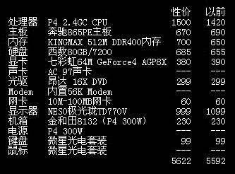 首先需要做的是利用报刊杂志及网络针对该机型的配件进行各地的报价分析。由于该配置的处理器是P4 2.4C GHz的CPU,所以价格很容易查询,而针对内存和硬盘的价格查询也是十分简单。至于其他配件则需要详细的解释了,该配置所涉及的主板官方报价为699元,显然该厂商在核算比较价格时多了些,而显卡和光驱的价格合计的就很到位了。至于Modem、网卡和显示器的价格则无从查询,因为二合一的猫网合卡的价格根本就查不到,并且由于不知道显示器的具体性能参数,所以也无法进行具体的报价,那么在这三个配件上就按照品牌机广告上的价格进行合计。最后在机箱电源与鼠标键盘这两个方面也无从下手,于是就利用了世纪之星8102(P4300W)和罗技光电套装的价格进行合计比较,相信世纪之星的质量和罗技光电套装的口碑也不会比该品牌机的原配差多少。