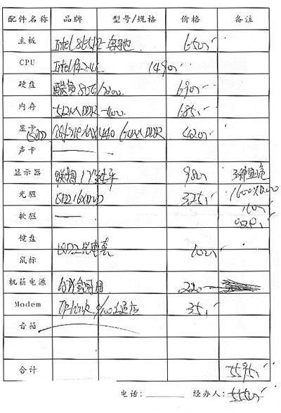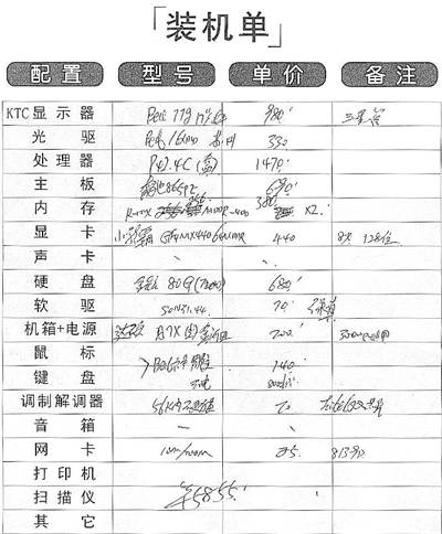 第一家的报价让我很是困惑(图4),价格看起来适中,但合计下来发现超过了价格上限,而且还发现市场上根本就没有二合一的猫网合卡。当我拿出来品牌机的宣传单和声称明天就准备配机的情况下,报价员在第二天配件价格不变动的情况下把报价承诺到了6000元。但是不用我说你也明白,6000元还不如去买品牌机,虽然这个装机“超市”有一年的硬件免费上门服务,但也不至于让我去放弃品牌机更好的服务。结论出来:品牌机胜出。