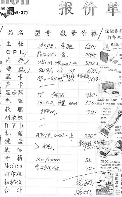 第三家我选择了QDI的代理(图6)。你可以通过这张报价单发现,所配出来的“准”品牌机的价格将比“正”品牌机便宜不少。这也说明除了我们所研究的品牌以外,其他品牌也同样与兼容机存在一定的价格差(报价员还推荐了一款QDI的主板价格1380,赠送GeForceFX5200的显卡,性价比非常高)。最后在我确定次日购买的情况下,给我报出了5550元的低价(其他配件价格不变的情况下)。